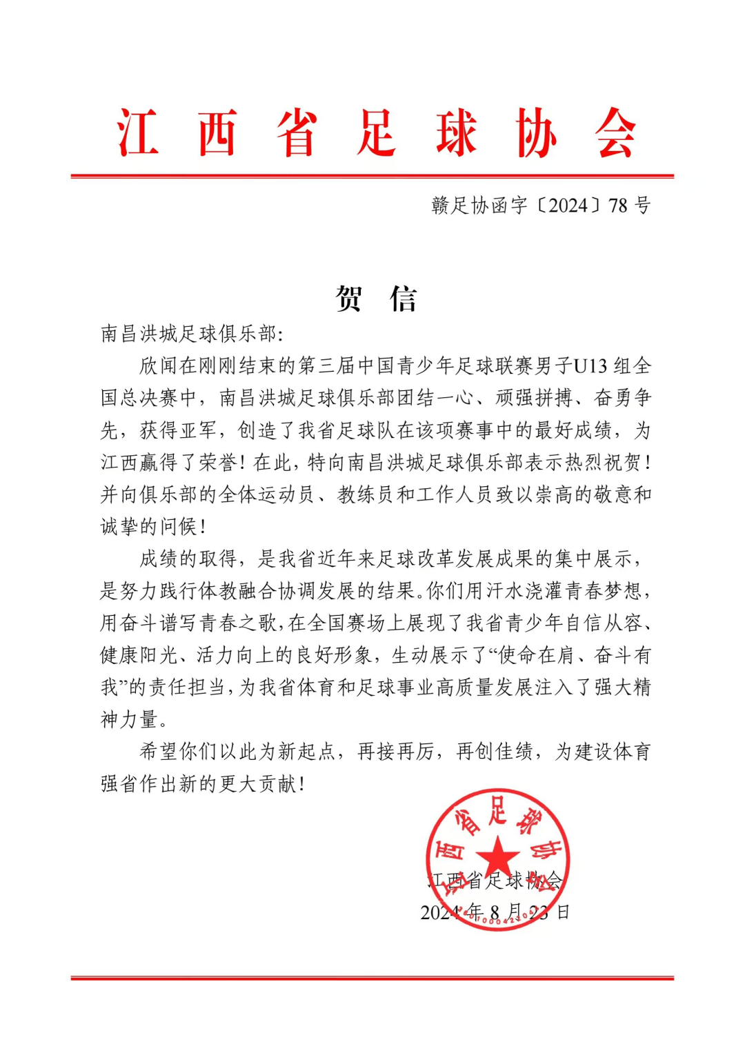 赛后,江西足协第一时间向南昌洪城足球俱乐部发去贺信,祝贺南昌洪城创造江西足球队在中青赛中的最好成绩,为江西赢得荣誉!近年来,江西足球改革发展工作不断取得突破,体教融合协调发展,青训工作硕果累累。南昌洪城足球俱乐部获得中青赛亚军的荣誉也将激励江西足球改革工作高质量发展,为中国足球改革发展贡献江西力量。